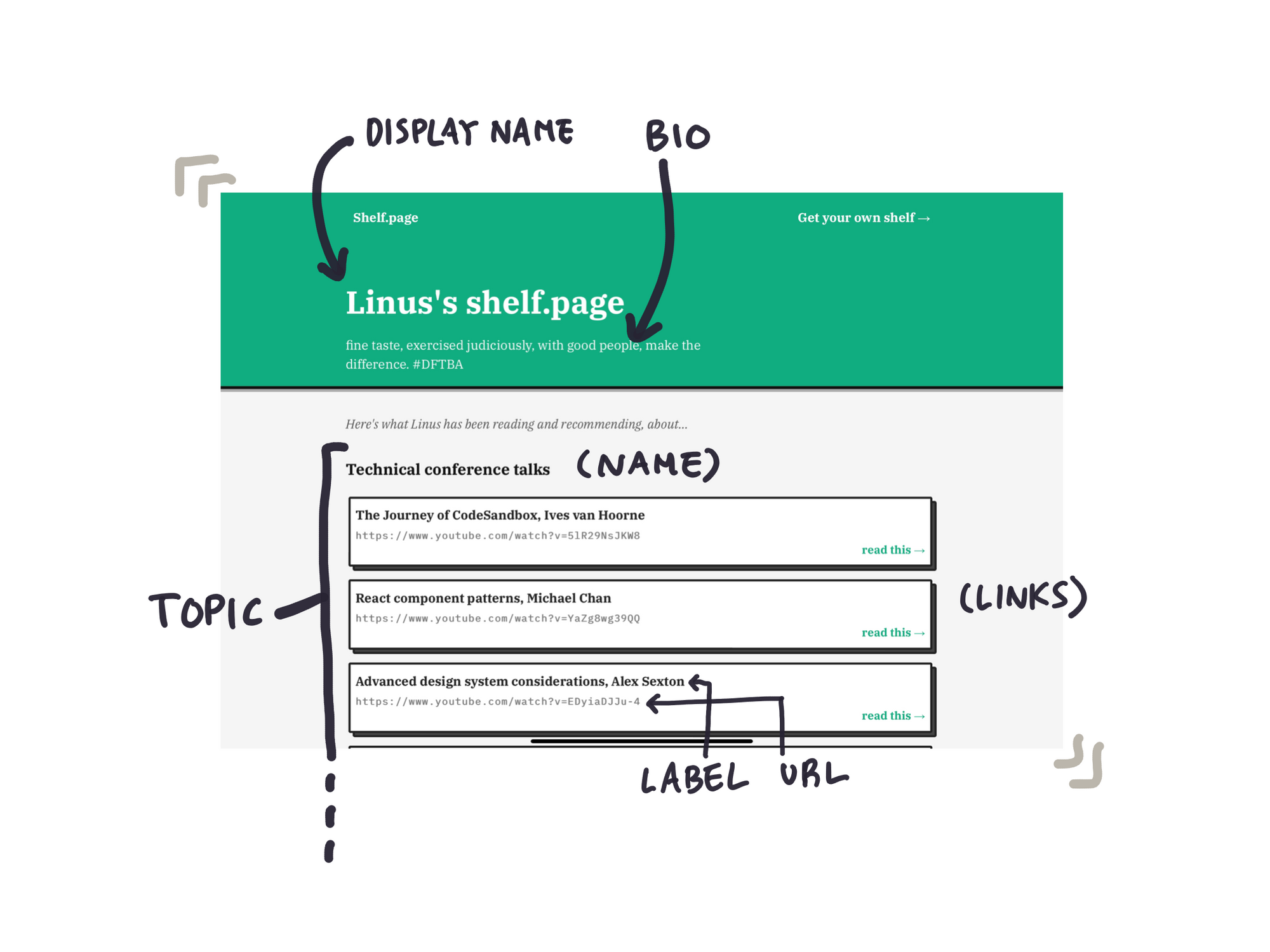 Because of this, a good first step to building a Remake app is to map out how your user’s data connects to your UI. For my Shelf.page app, I started with a schema like this: