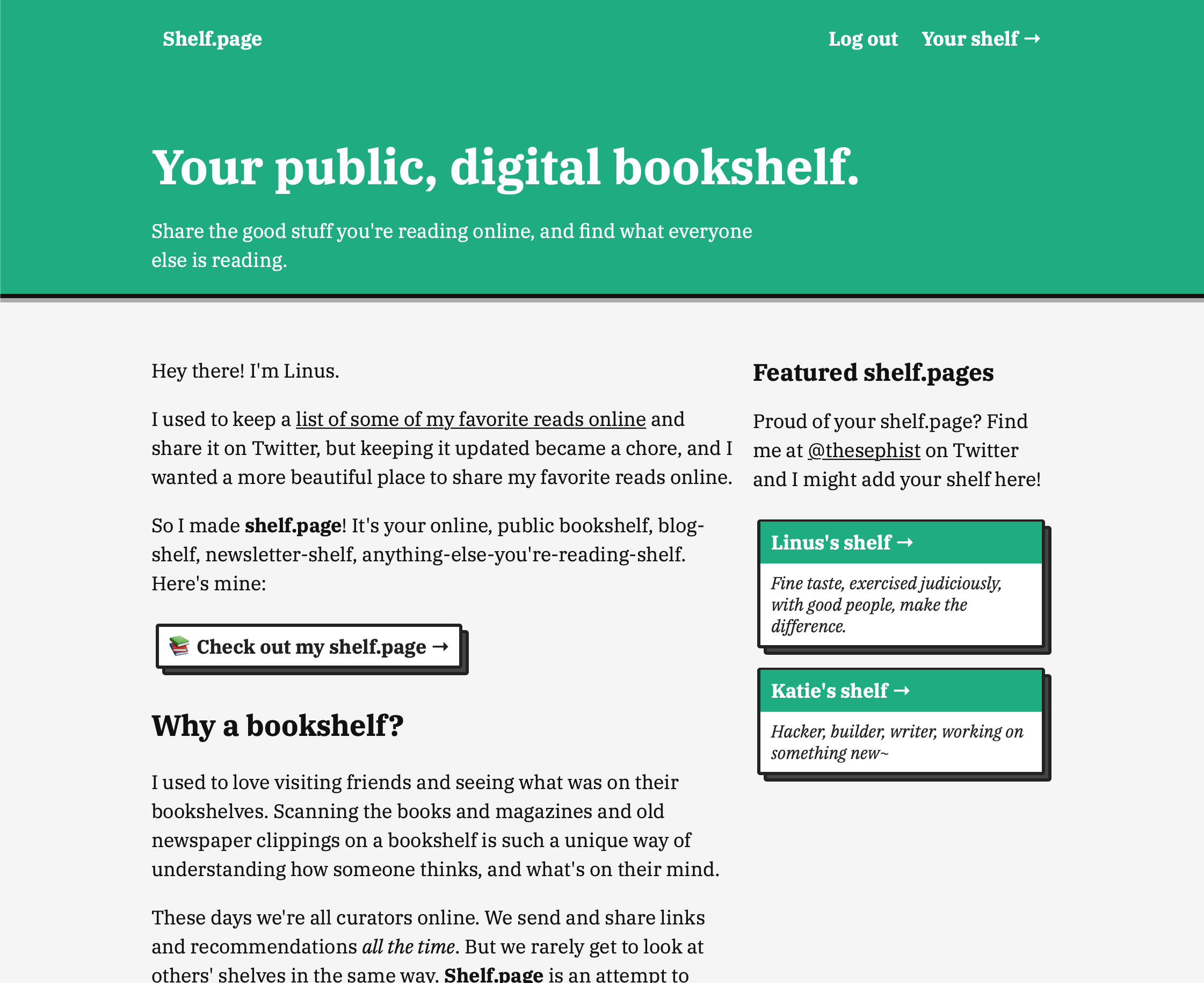 Shelf.page is representative of a really common kind of app. Every user gets a profile or account page at a unique URL, with a bunch of fields to customize their page and edit it themselves.