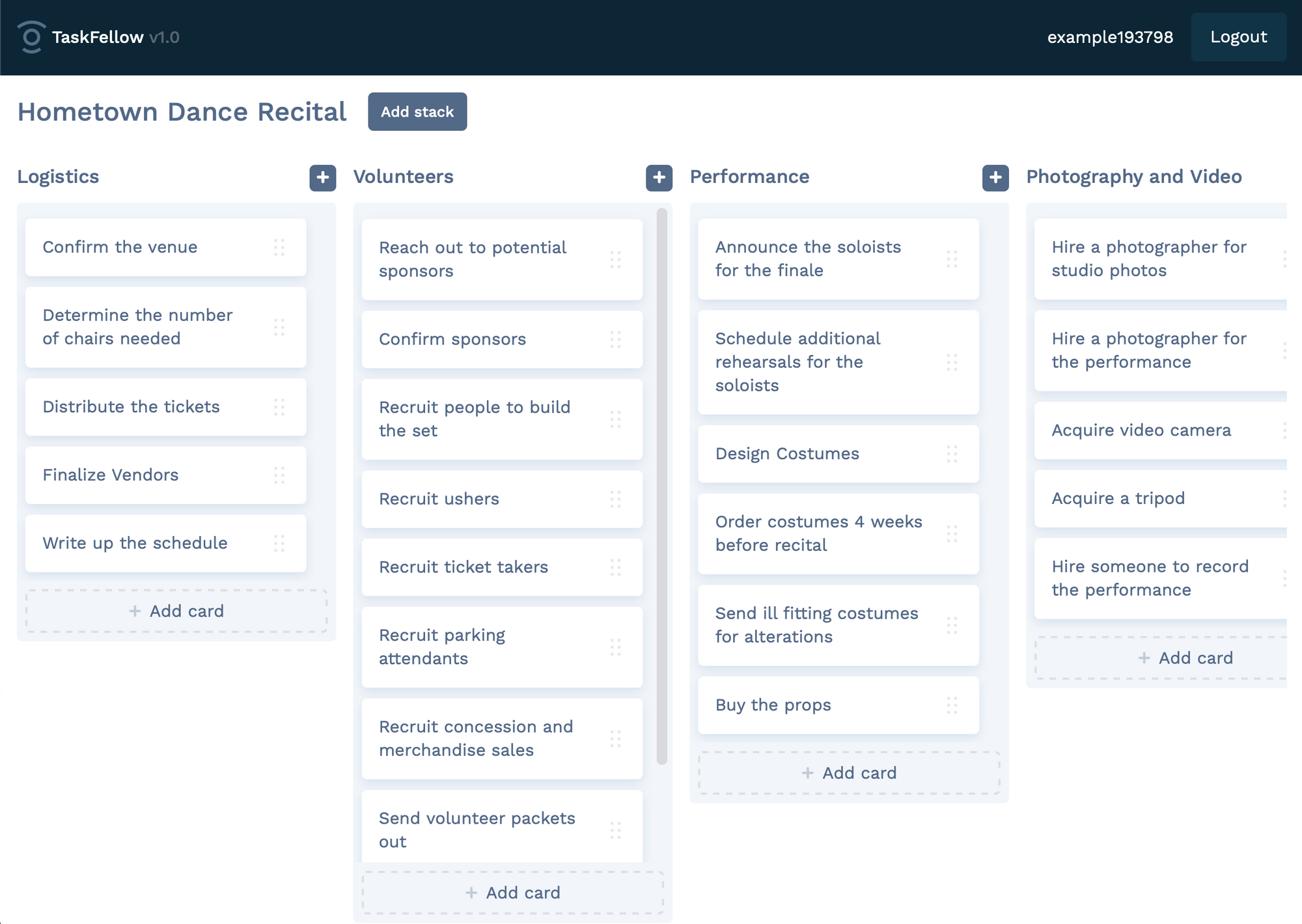 npm run devRemake will take a second to build the app, and start running the app at localhost:3000. Visit the URL on your computer to see the starter app, which is a Trello clone. You can also find this demo on the Remake website. It should look like this.