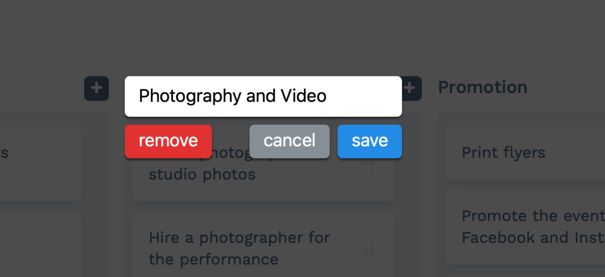 - When you edit some text, a modal opens with buttons to save, cancel, or (sometimes) delete the item.