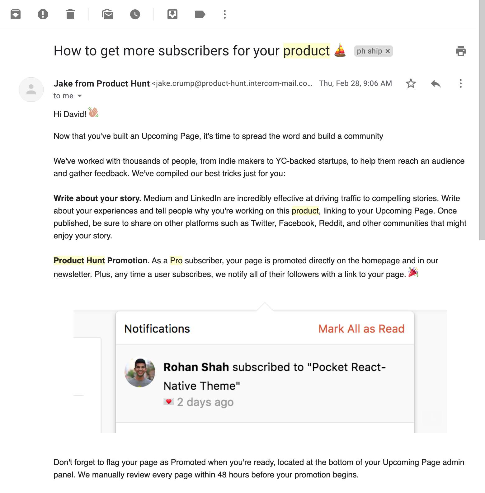 To be fair, Product Hunt Ship did send me one email with a mention of the "Promote on Product Hunt" toggle.