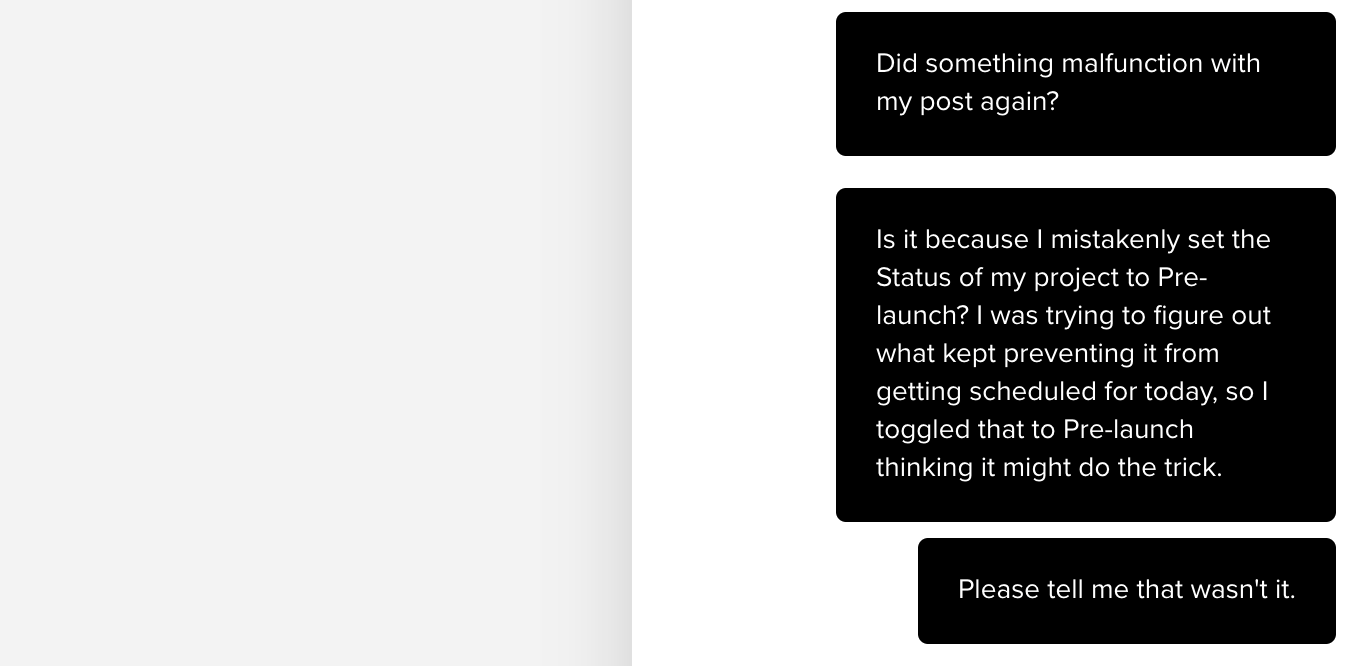 This is about the time someone on the Product Hunt staff told me to stop editing my post, because: "when you update the post, it stops it from being scheduled."