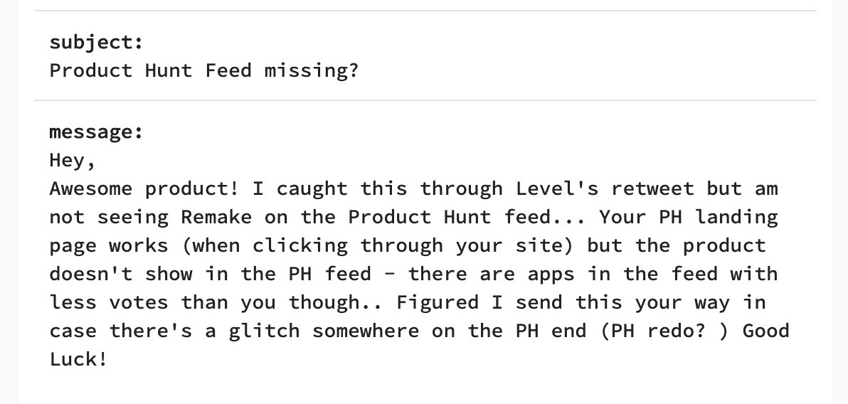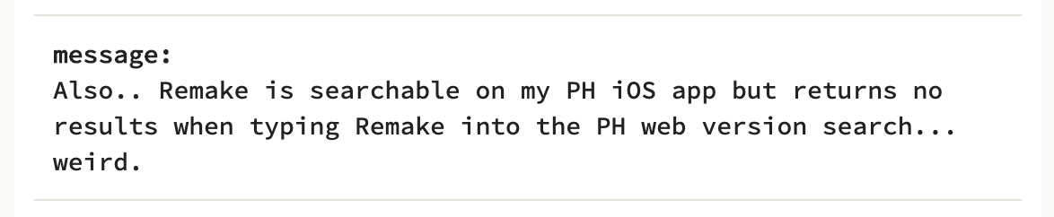 Then I got a couple of messages from Product Hunt users that Remake wasn't showing up anywhere on Product Hunt — not even when they searched for it. They said they had to go to the "New" tab and scroll forever just to find it.