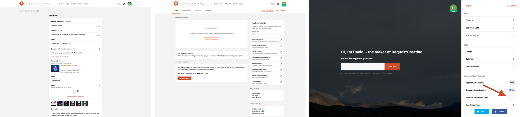 - This very important toggle wasn't mentioned on the Product Hunt home page after I logged in, nor on my personal profile page — nor on my product's Edit Post page.